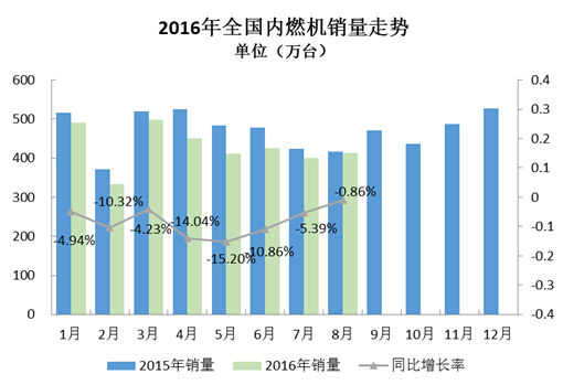 根据中国内燃机工业协会《中国内燃机工业销售月报》重点企业数据显示,数量方面,2016年8月完成内燃机销量413.15万台,环比增长3.12%,同比下降0.86%,累计完成3424.12万台,同比累计下降8.72%;功率方面,2016年8月完成17952.74万千瓦,环比增长4.03%,同比增长24.67%,累计完成功率148694.1万千瓦,同比累计增长9.25%;本月销量较7月有小幅增长,其中仅工程机械用及园林机械用环比下降;同比方面农机用、船用、摩托车用降幅较大;累计销量同比降幅仍近9%;柴油机销量持续低位徘徊,汽油机总体小幅下降。