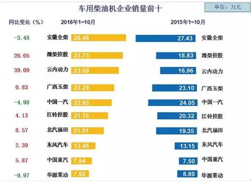 统计在内的22家车用柴油机企业销售数据显示,1~10月,约六成柴油机企业销量实现增长,增长幅度最大的是老牌柴油机企业江西五十铃,实现42%的同比增长;22家企业中有9家企业前10个月累计销量呈现下滑,上海日野下滑50.35%,降幅最大。