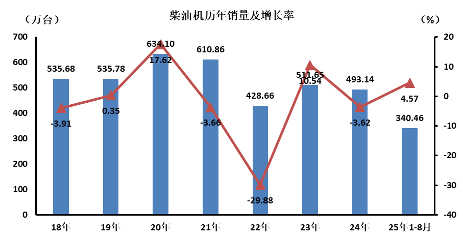 据中国内燃机工业协会统计分析,2025年8月,柴油内燃机销售37.25万台,环比增长1.42%,同比增长5.56%;1-8月累计销量340.46万台,同比增长4.57%。